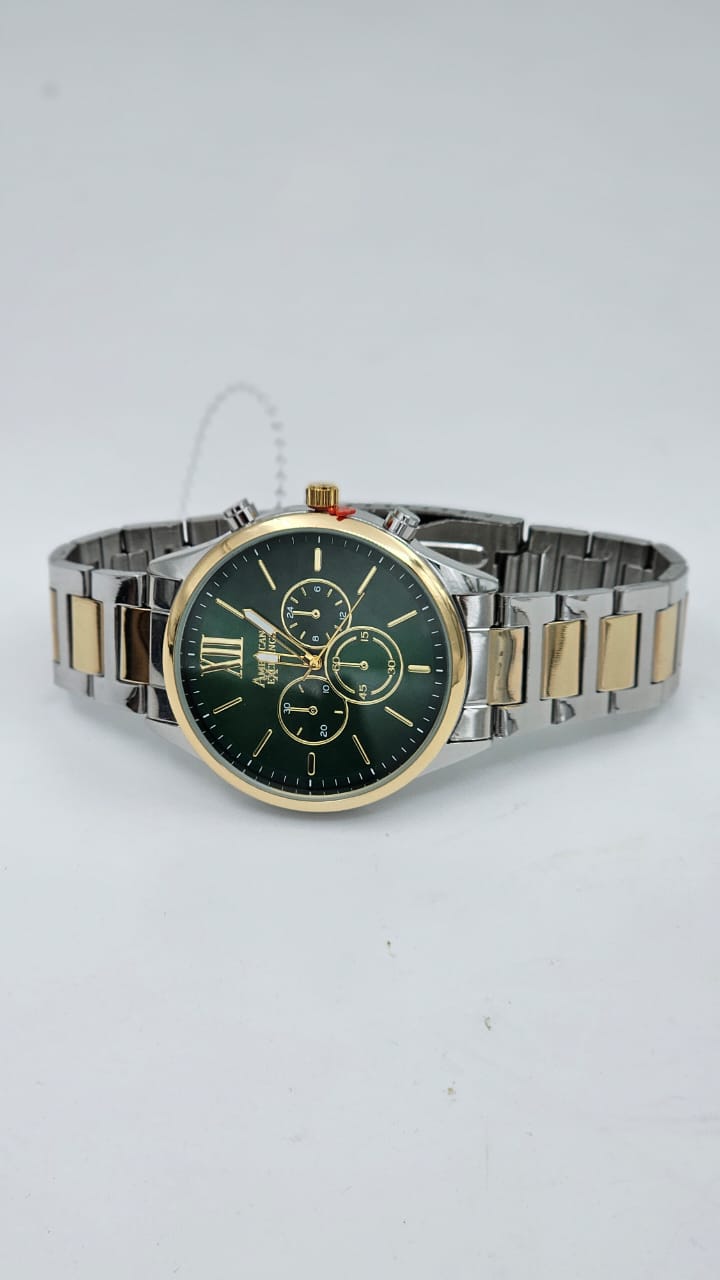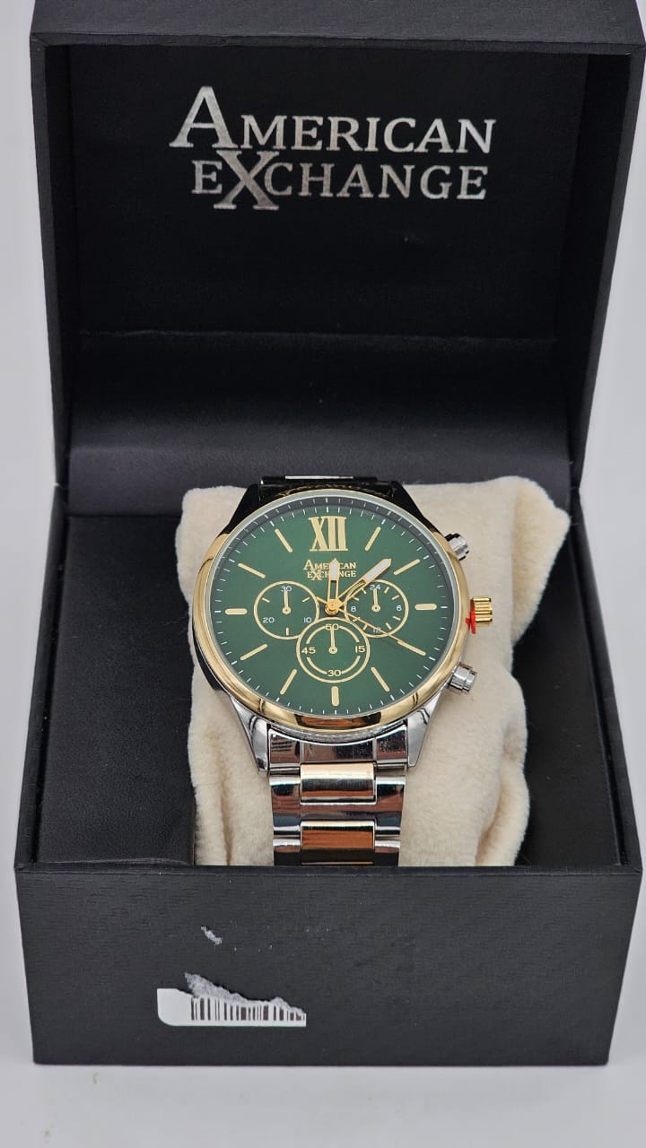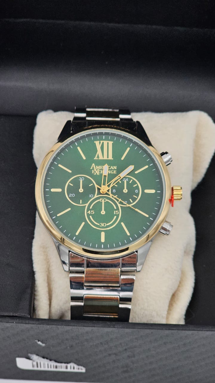 Destaca tu estilo con el Reloj American Exchange para Caballero, una pieza diseñada para hombres que aprecian la sofisticación y la presencia. Su imponente carátula verde con detalles en dorado combina perfectamente con su pulsera en acero inoxidable bicolor, creando un equilibrio ideal entre modernidad y elegancia clásica.