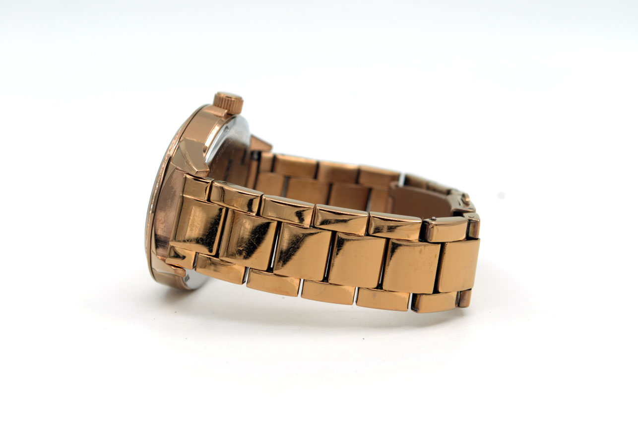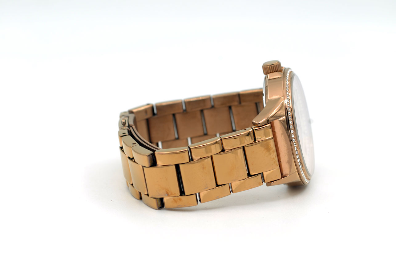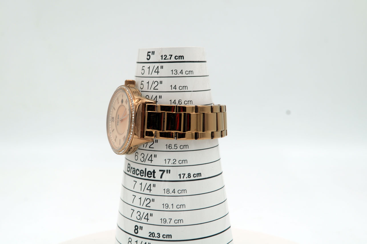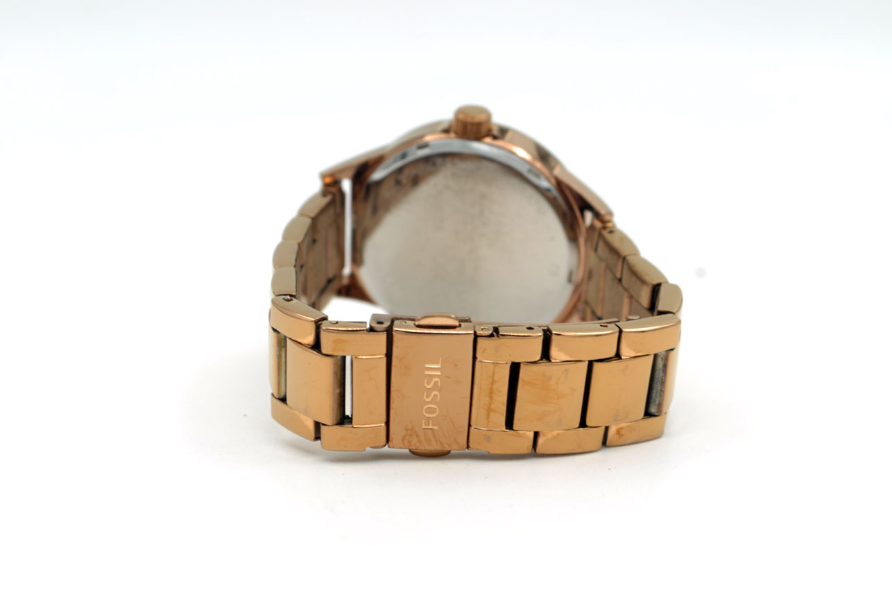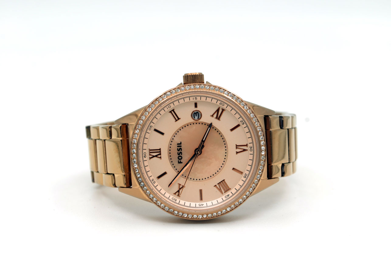 Fossil BQ-1108 para dama todo de acero inoxidable anodizado en dorado Gold Rose con precioso dial dorado madre perla, fecha y numerales romanos. Agujas luminosas y zirconias en bisel.