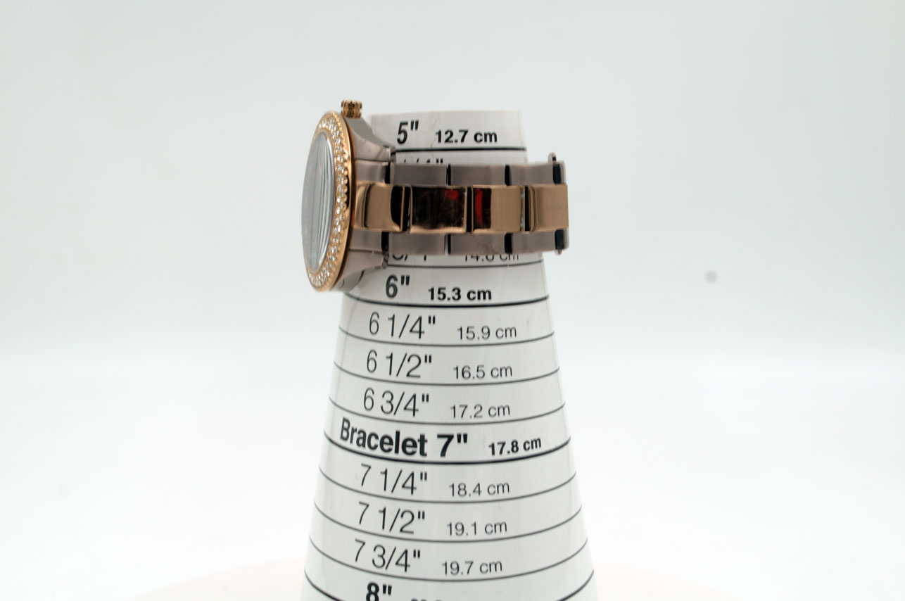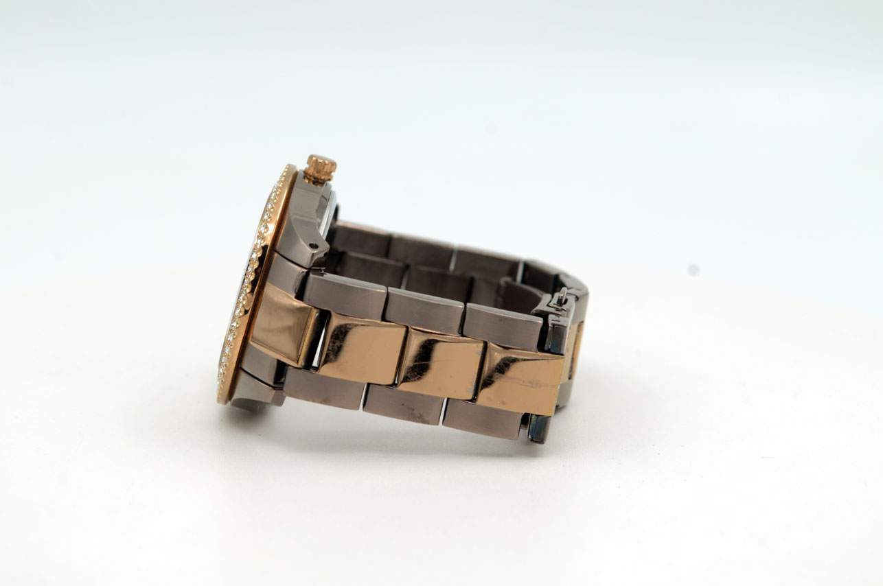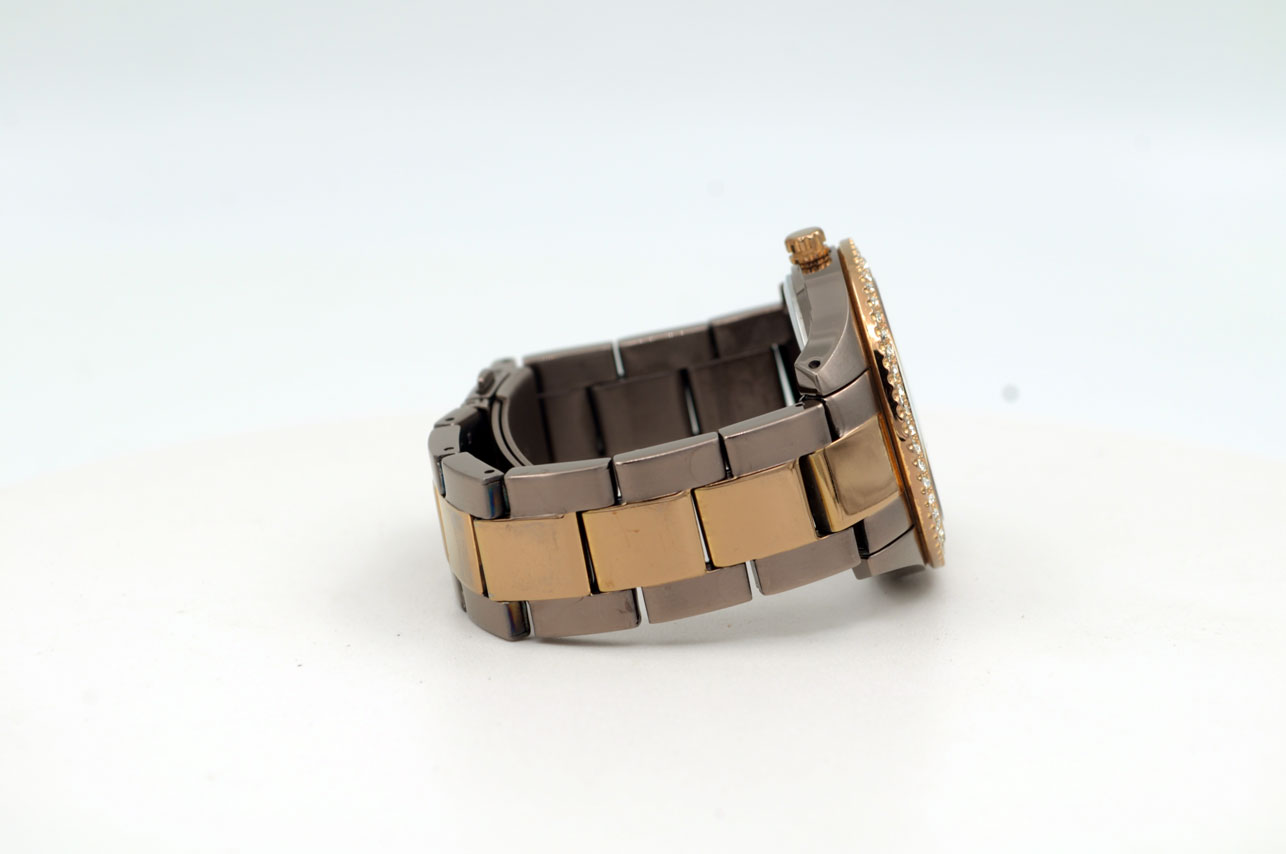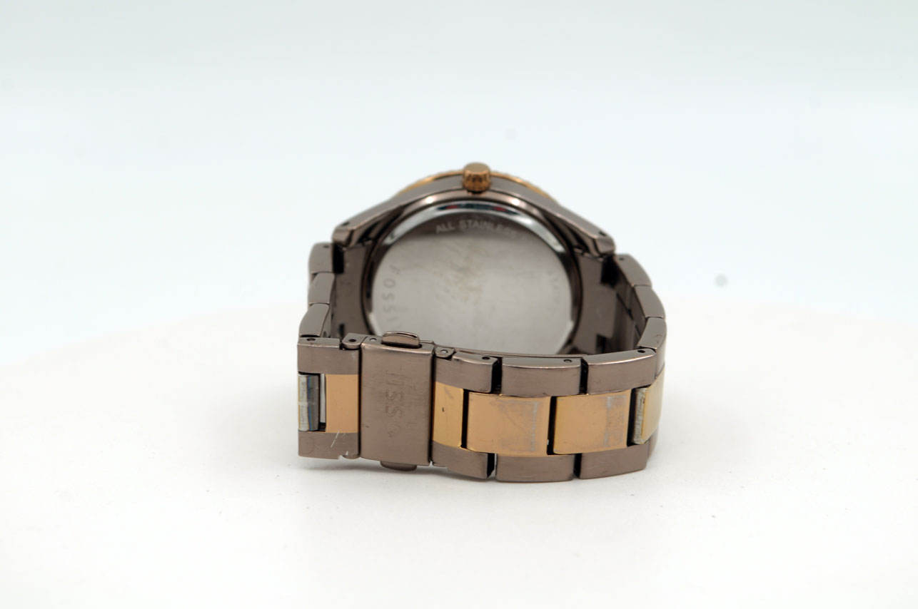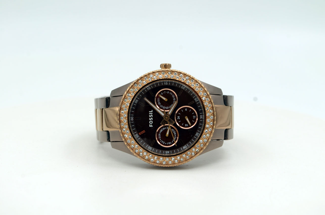 Fossil BQ-1108 para dama todo de acero inoxidable anodizado en doble tono, bisel 3 ojos con agujas luminosas y zirconias en bisel.