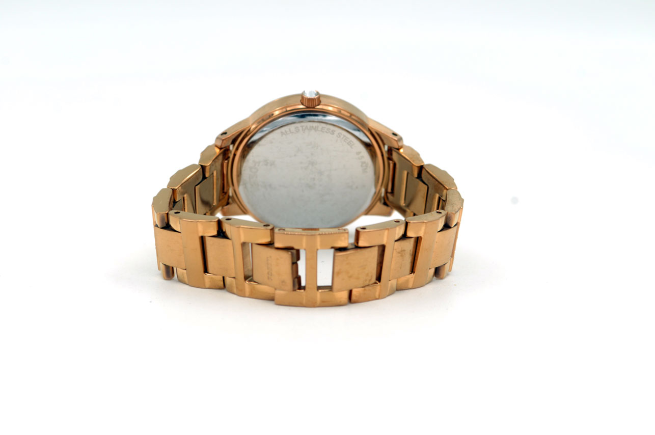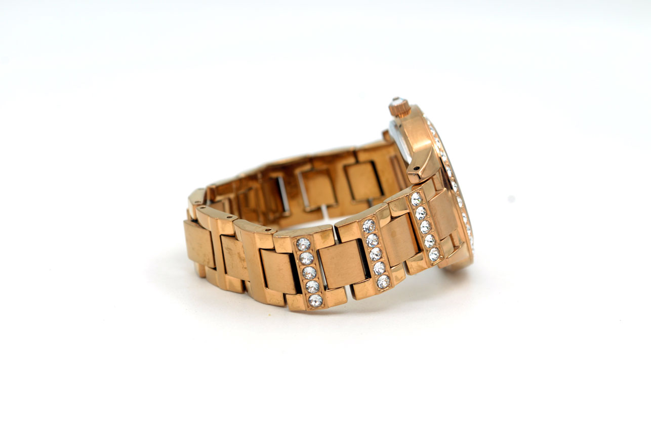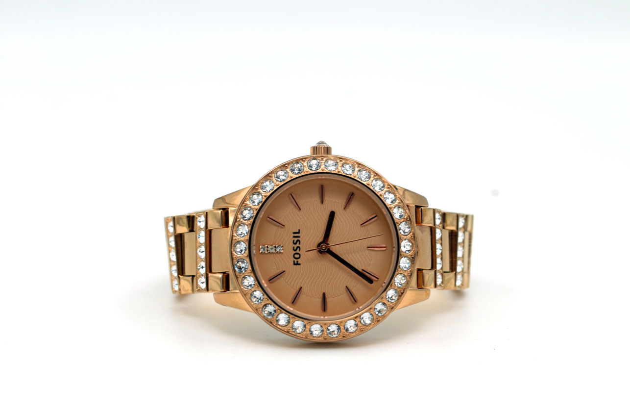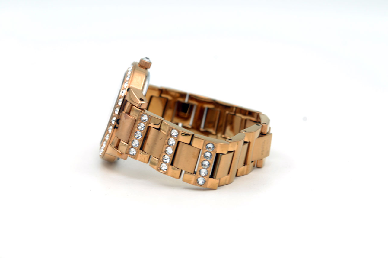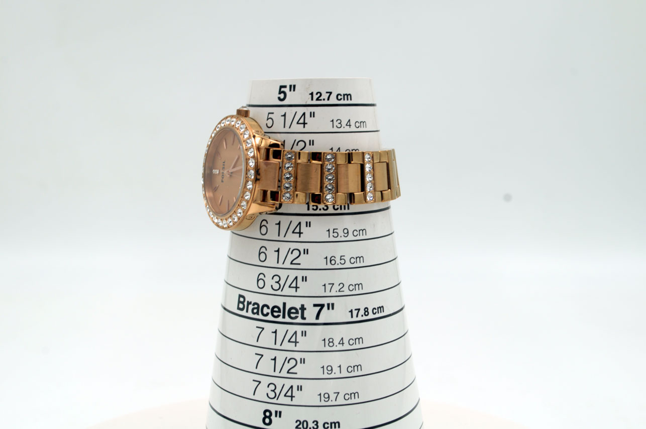 Fossil ES-3020 para dama todo de acero inoxidable anodizado en dorado Gold Rose, dial dorado con zirconias grandes en bisel, faja, en todos lados.