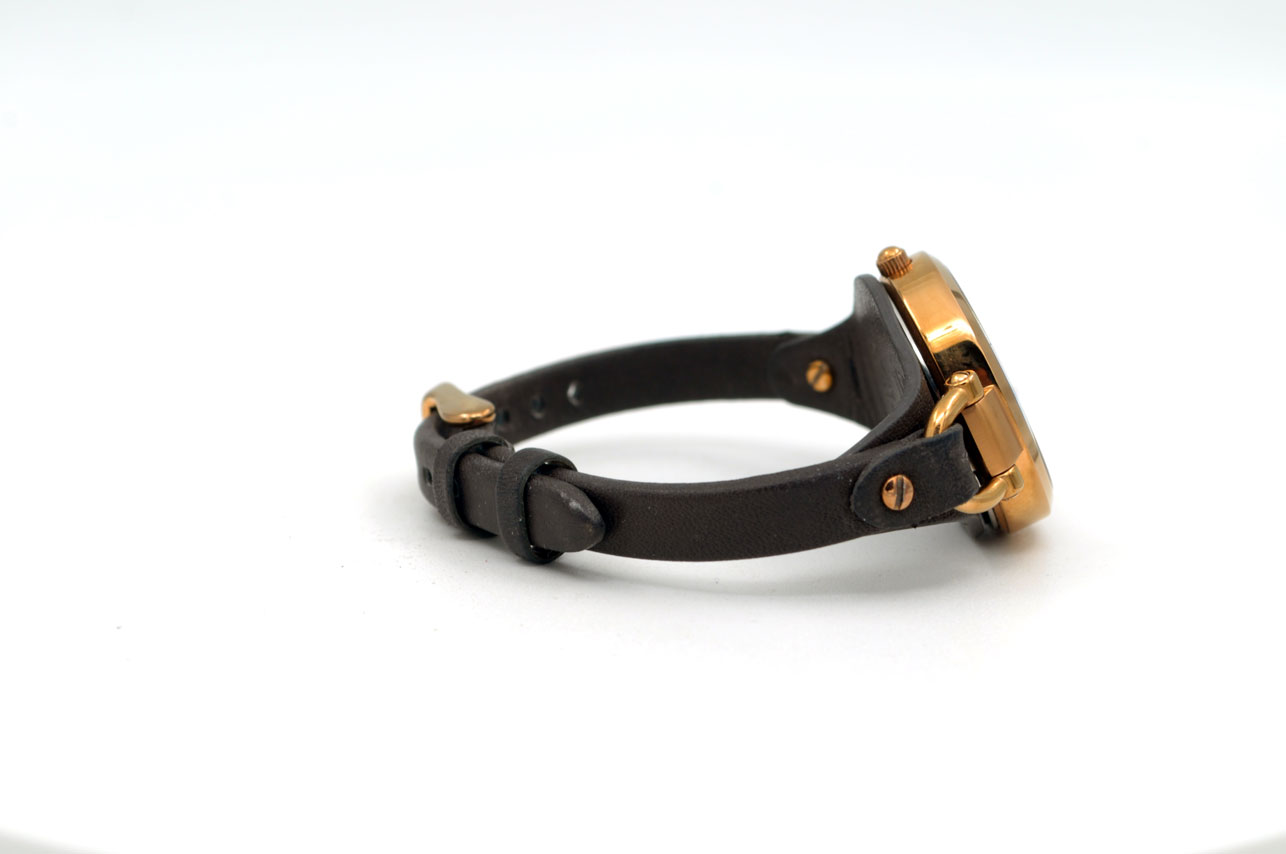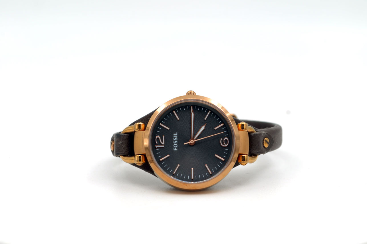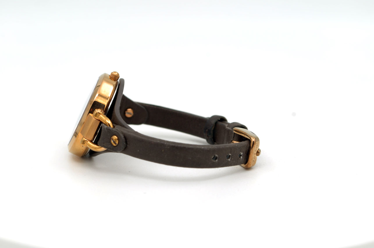 Bonito Fossil para dama anodizado en dorado Gold Rose con autentica faja de cuero de becerro.