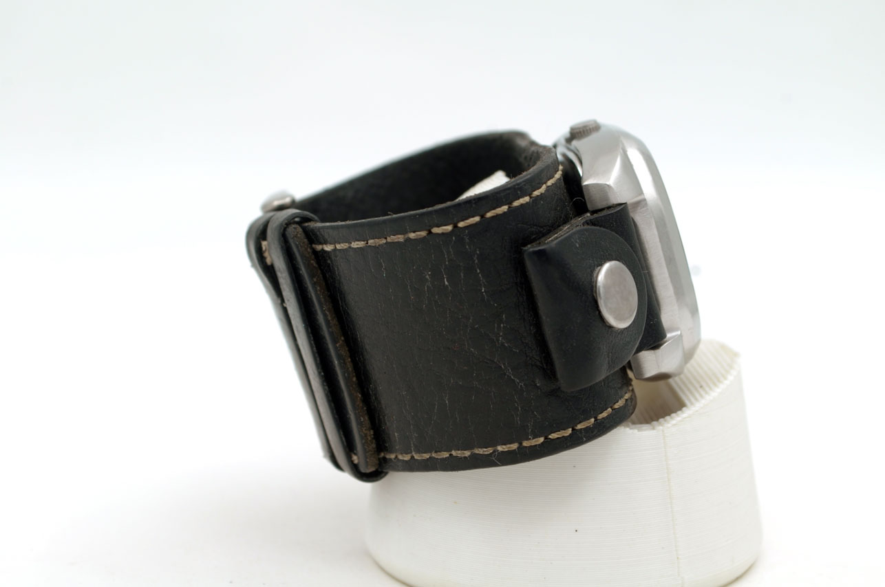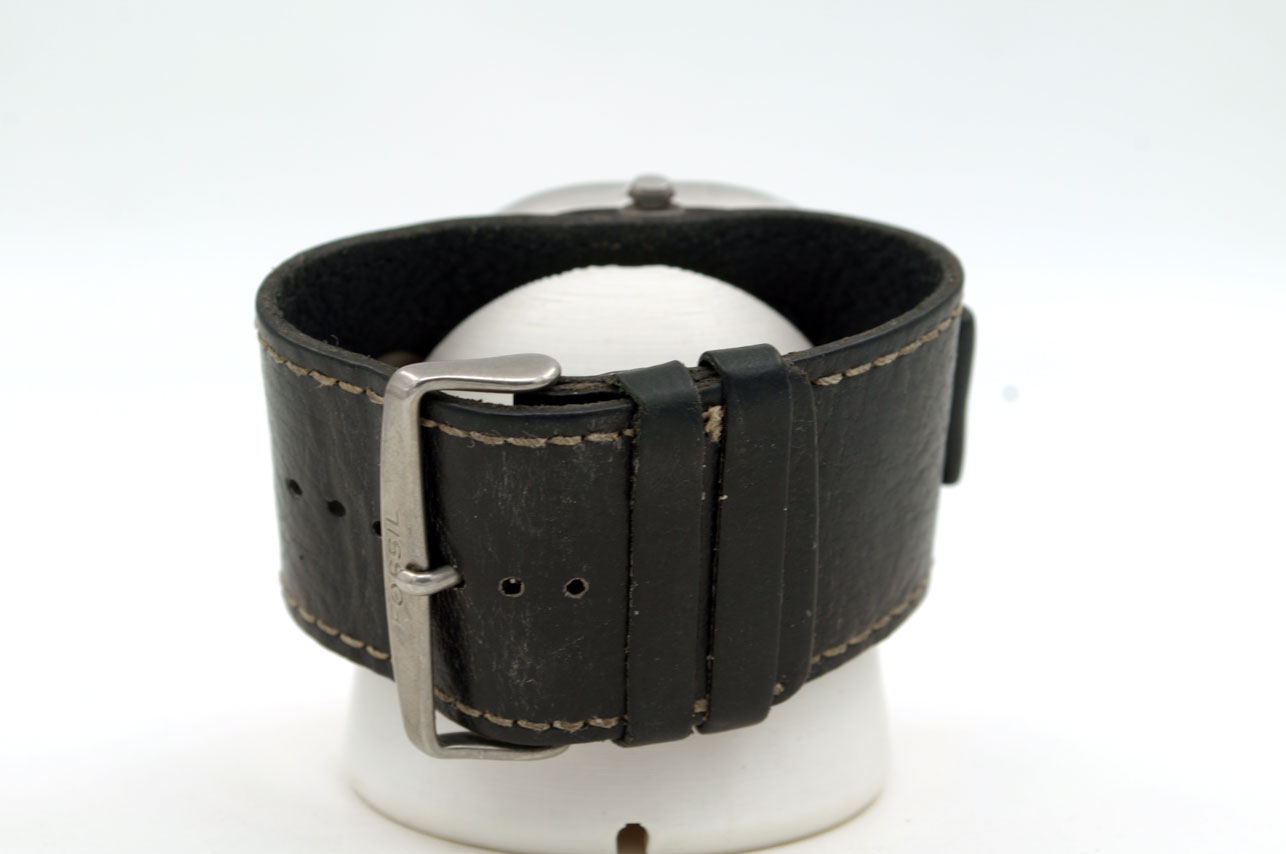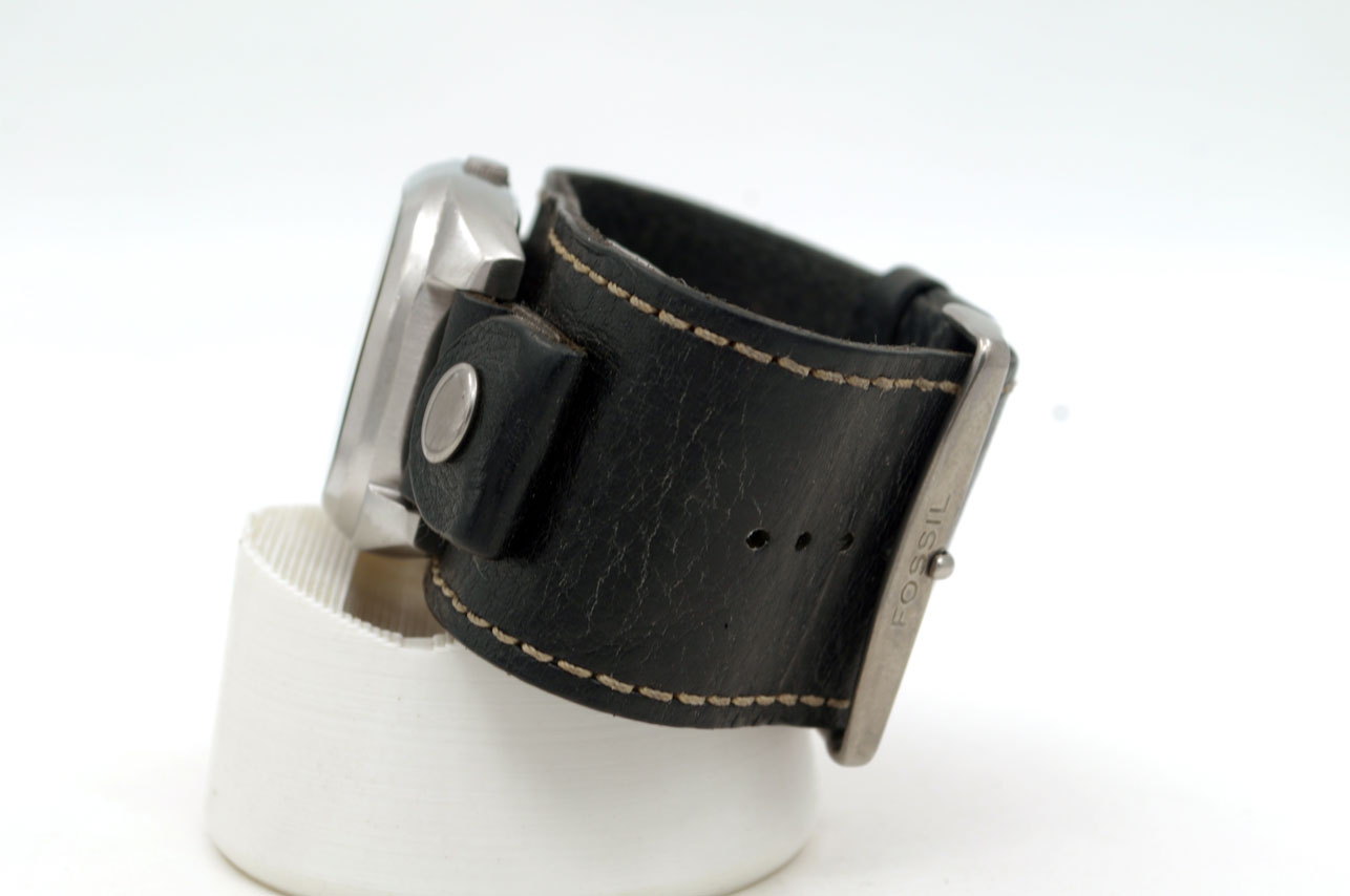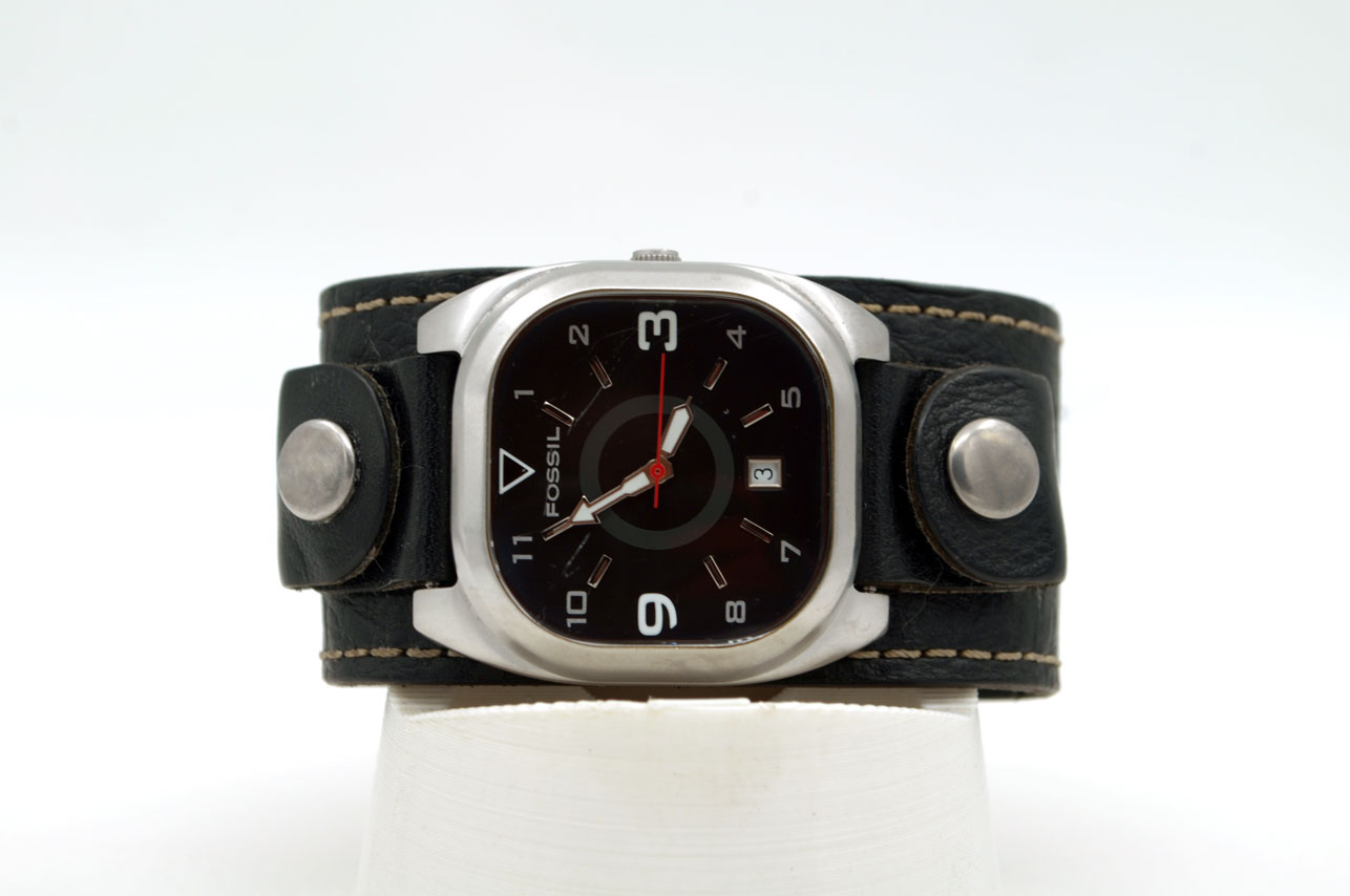 Reloj Fossil cuadrado con autentica faja de cuero de becerro estilo brazalete, dial negro con fecha y agujas luminosas.