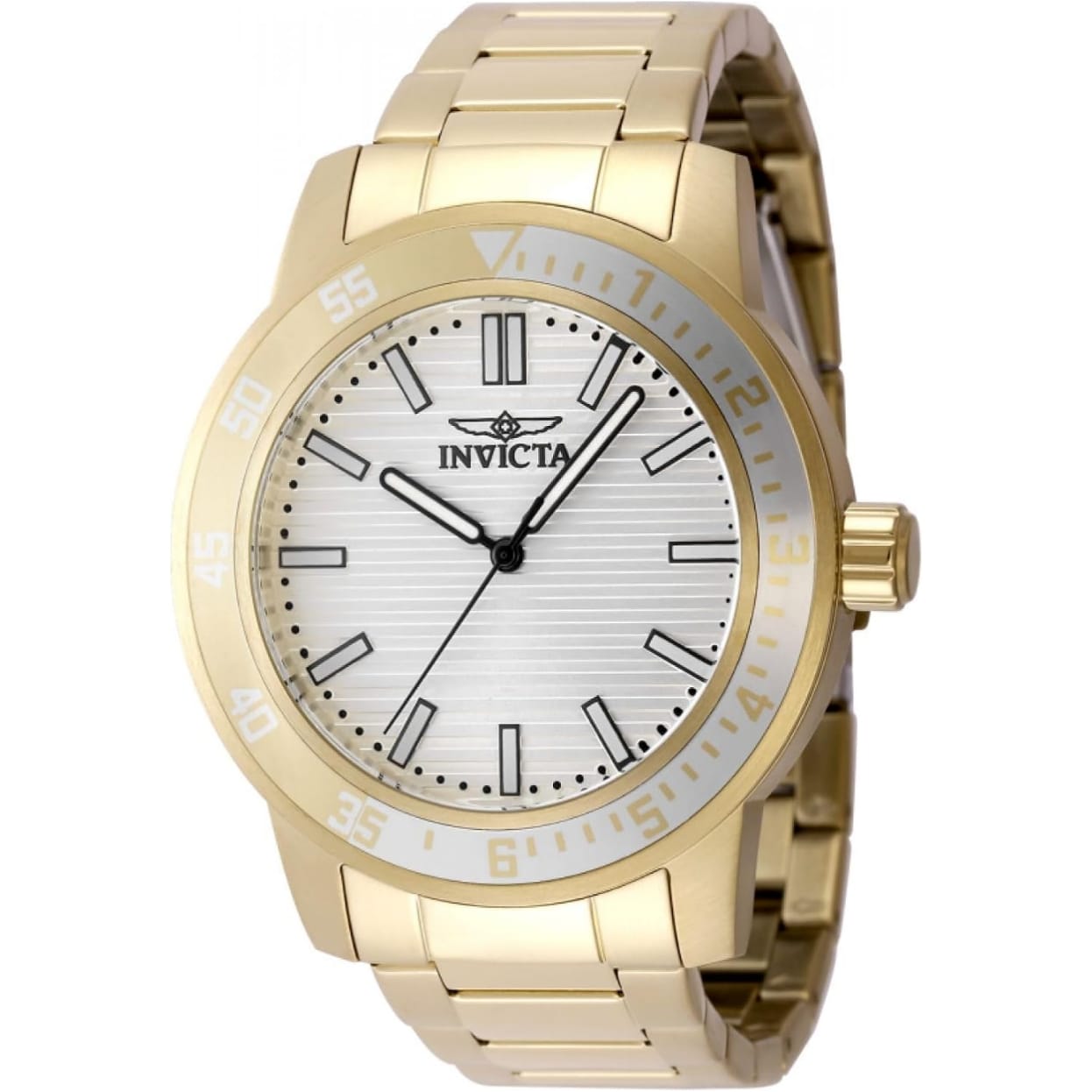 El Invicta Specialty 45mm es la combinación perfecta entre sofisticación y presencia masculina. Su diseño en acero inoxidable tono dorado con detalles plateados proyecta elegancia, mientras que su amplia caja de 45mm brinda un estilo moderno y dominante en la muñeca.