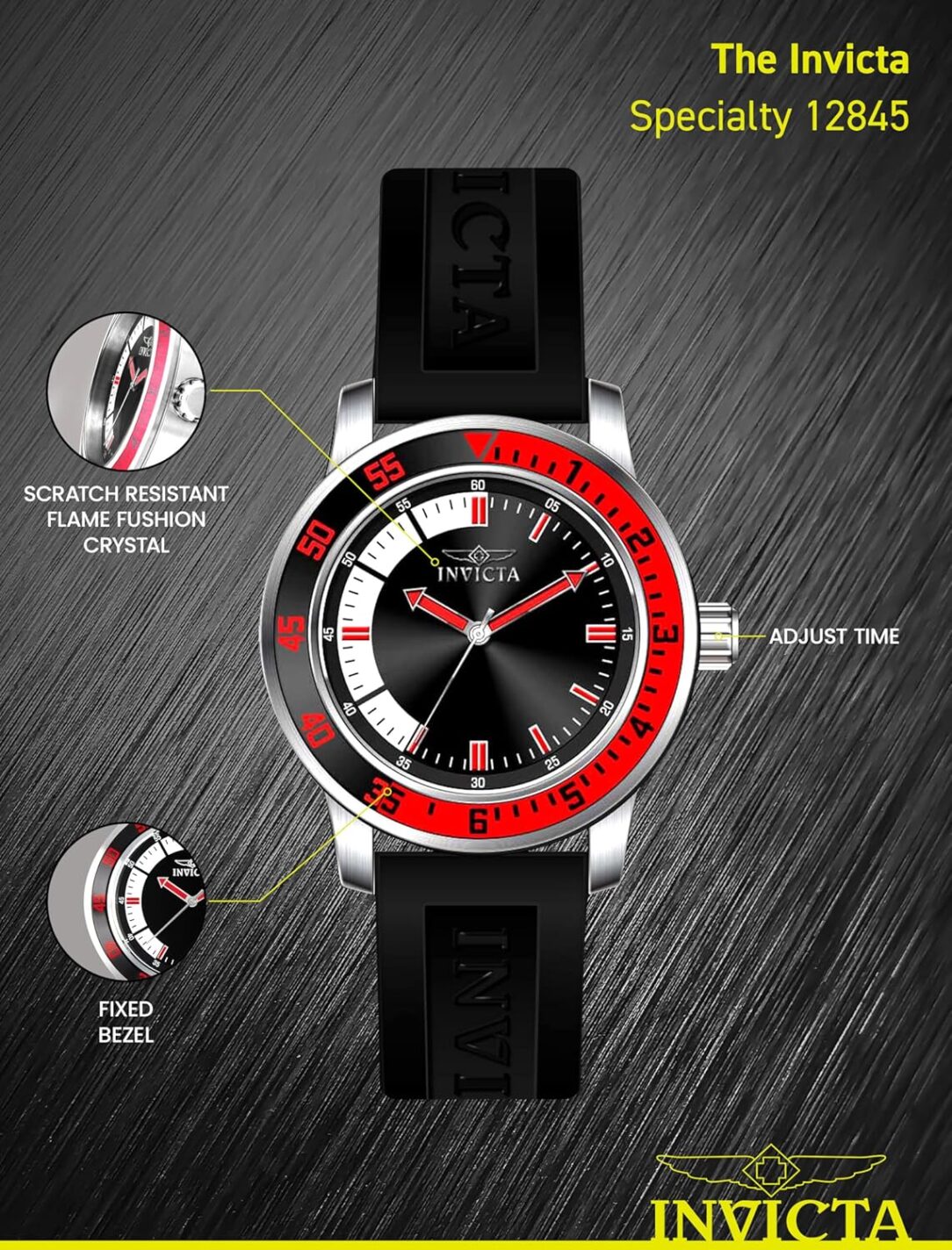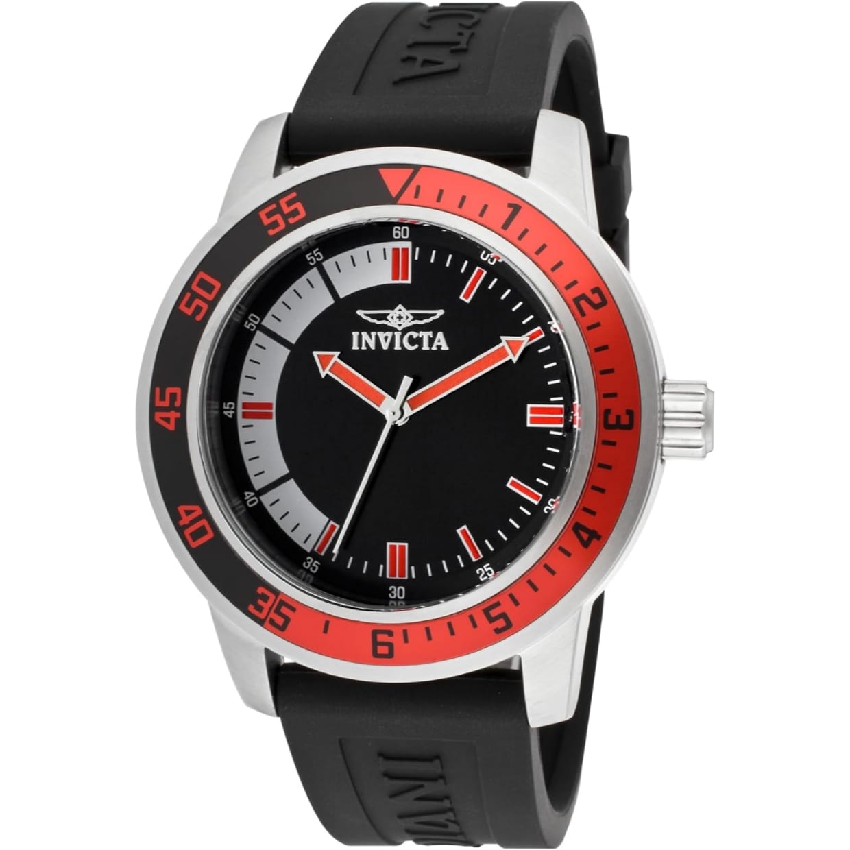 El Invicta Specialty Sport Black & Red combina diseño robusto, precisión japonesa y un estilo deportivo moderno. Su caja de acero inoxidable de 45 mm destaca por su presencia fuerte y elegante, complementada con una carátula en tonos negro y blanco que facilita una lectura clara y precisa.