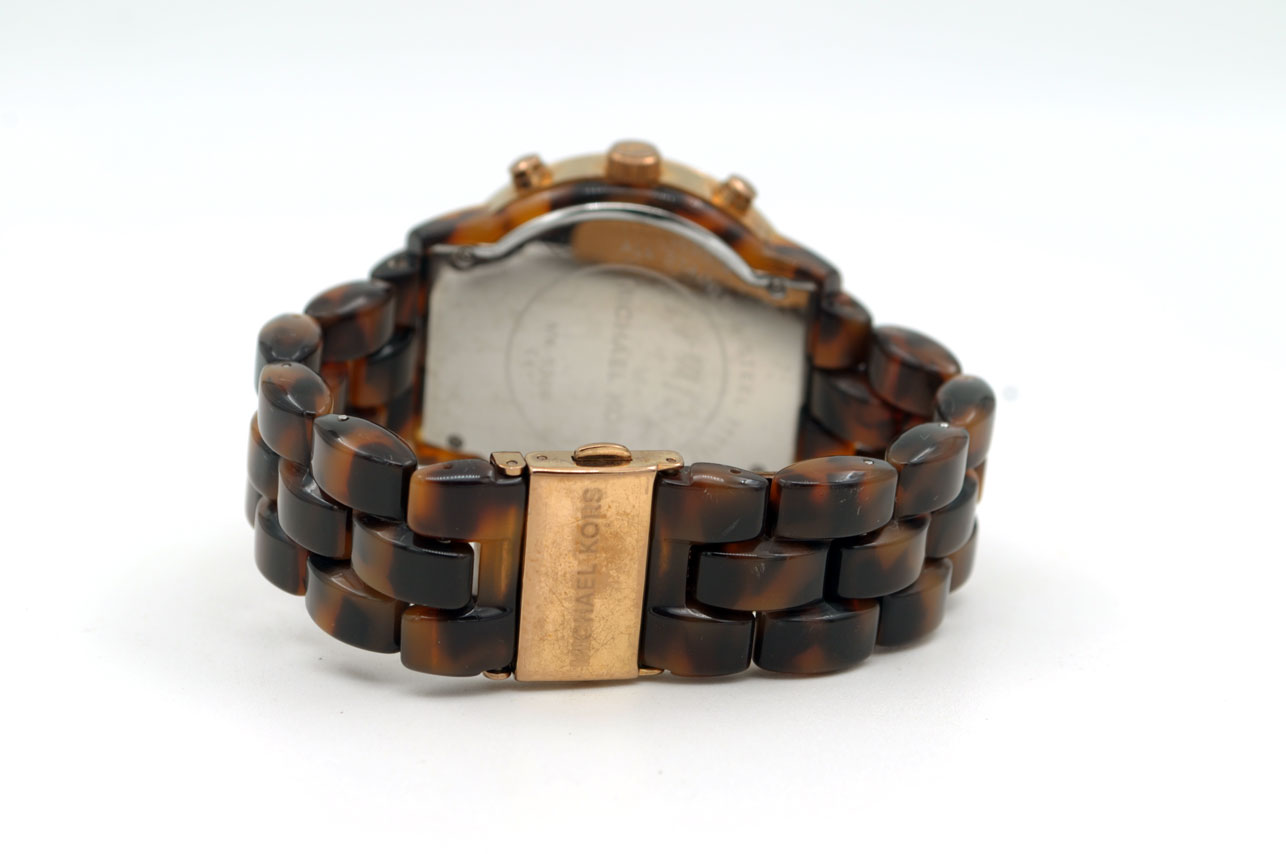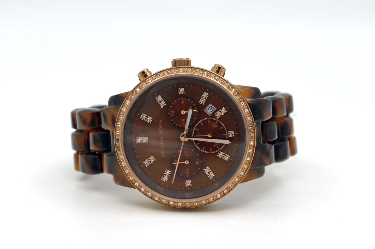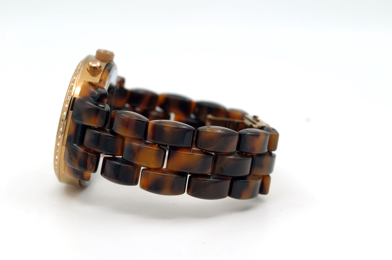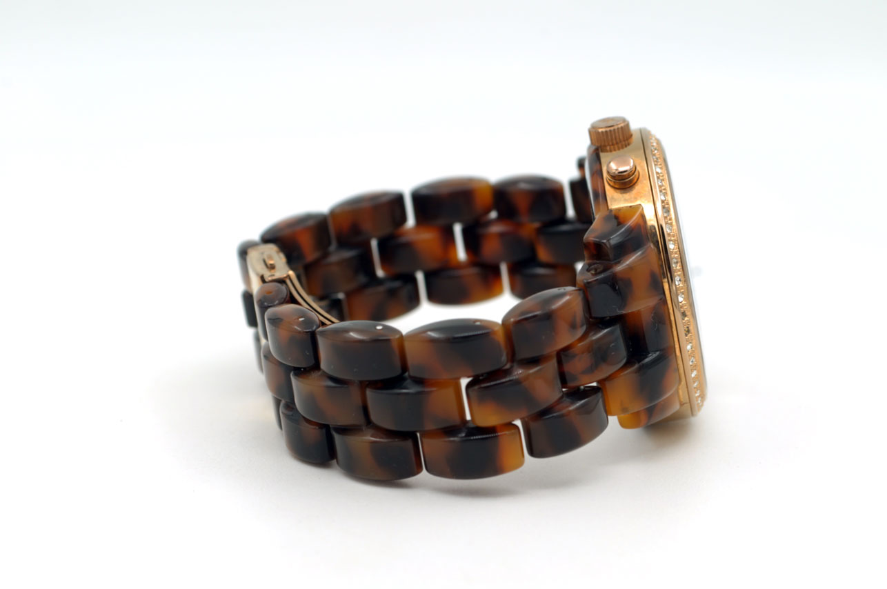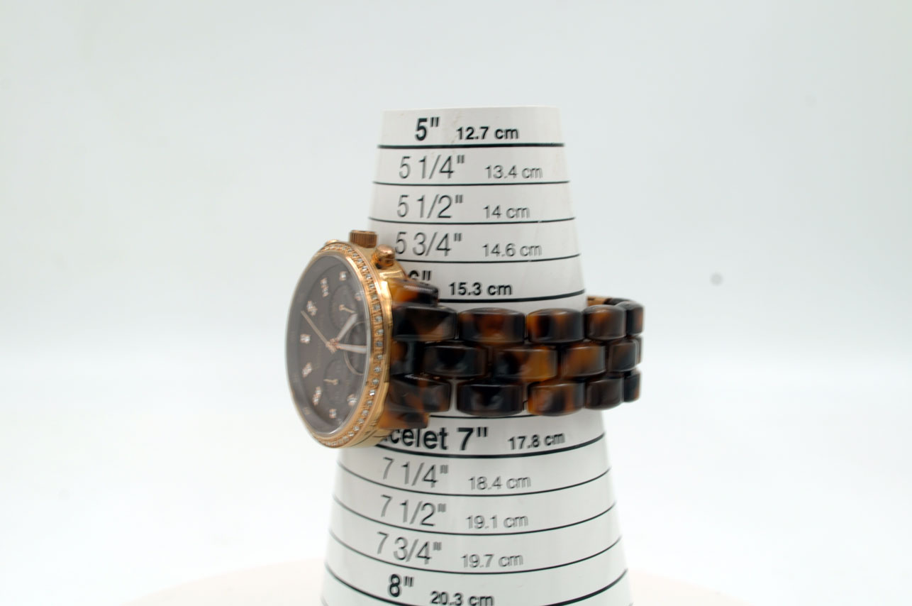Precioso Michael Kors para dama con patrón Carey. Maquina cronografo de 60 mins, dial con zirconias y agujas luminosas en dorado.